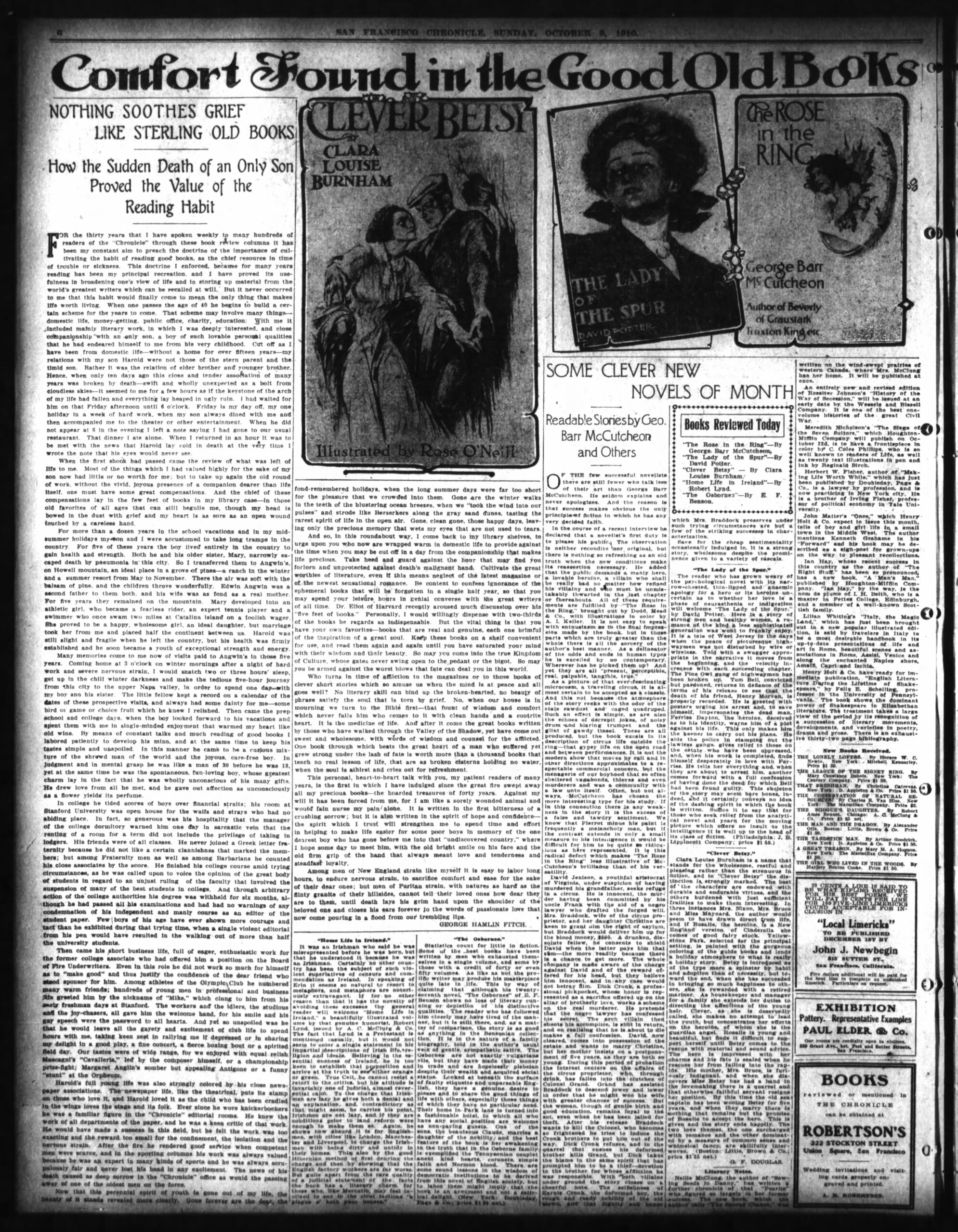 In the weeks following Fitch’s article in the Chronicle, many readers asked him to list the great books that had proved so comforting to him in his sorrow. Fitch did so in his Sunday columns over the following weeks. In 1911, he gathered them together and published them under the headline of his original article, Comfort Found in Good Old Books. It proved a good seller for Paul Elder and was reprinted several times.